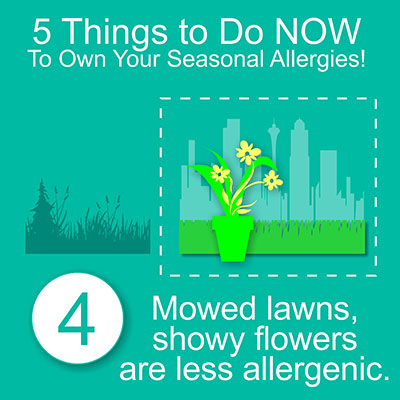 Manicured lawns and well-tended gardens are less likely to have wild flowering grasses or weeds like rawgweed. Be aware, however, that trees are frequent culprits in allergy season, so elm, mulberry, willow and others are still wind-borne pollinators. Steer clear of those during the spring.