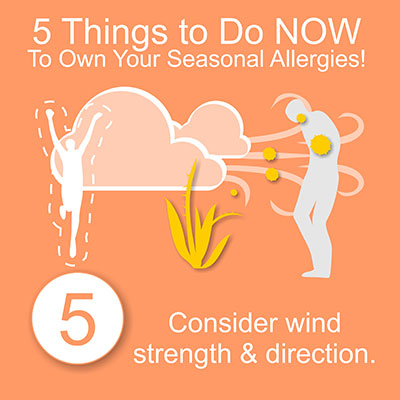 If you were standing north of me on a road that ran from the North to the South, and the wind was blowing from the North the the South, and a pollinating ragweed plant was between us, I would be well-served to come stand by you because I could at least avoid the pollen from that plant. Pay attention to where disturbed soil (construction sites, agricultural fields, neglected lots) is growing weeds and where the wind is taking the pollen. If you have a choice and can be up-wind from places like that, you could avoid high dosages of allergenic pollen.